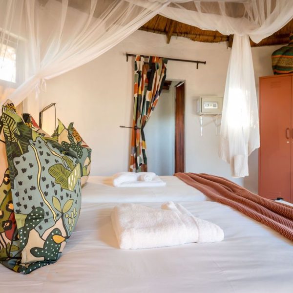 Sprawled across the camp there are 5 chalets built from brick and thatch, each furnished with rustic decor and simple colour accents inspired by the surrounding bushveld. Rooms have mosquito nets, showers, and standing fans. For the more adventurous, there is a treehouse which can be booked at an extra cost.